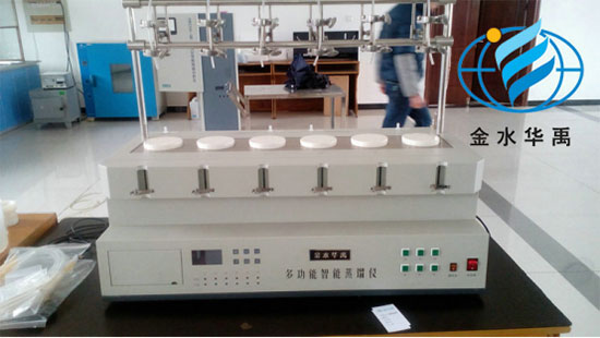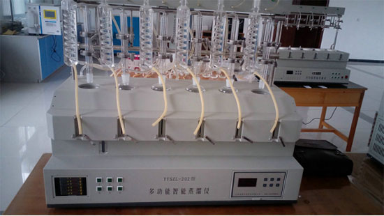 智能一體化蒸餾儀主要由加熱裝置、蒸餾裝置、循環冷卻水裝置和接收裝置四部分組成。加熱裝置設置了加熱速率智能控制功能,可實現加熱溫度和加熱效率精密控制;蒸餾裝置為專利性設計,蒸餾效率高、冷凝效果好;循環冷卻裝置設置了冷卻溫度顯示和控制功能,可確保冷卻效果。接收裝置設置了蒸餾終點檢測和自動停止加熱功能,實現了智能加熱控制。